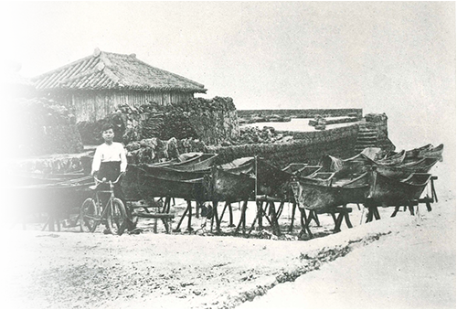 小型の木造舟サバニを操る海人のまち糸満で