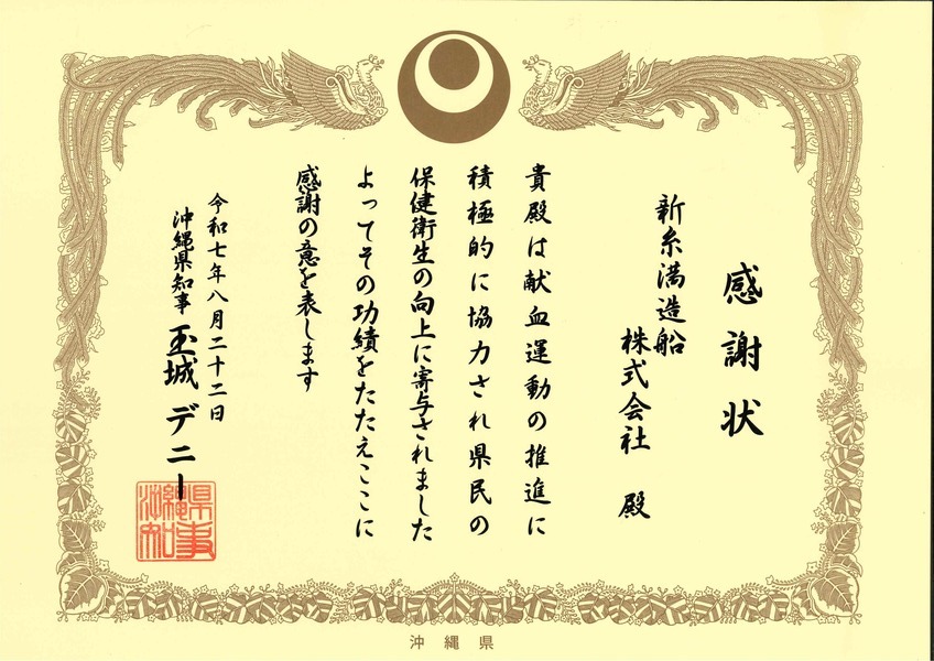 遅ればせながらご報告です。永年にわたる献血への協力に対し、沖縄県知事感謝状をいただきました。先の2025年8月22日沖縄県庁にて、献血運動指針功労者表彰式が執り行われました。